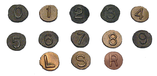 California Edison Nails are all steel raised and found in Southern California. They have a Large "E" and the Date on the head of the Nail. The Unique one is the small 36, which has a very small Date and Letter "E" and is the rarest of the Edisons. SCE also has a set of copper Code nails consisting of 0-9 and the letters L S R. And several sets of Steel Round Indent Code Nails (Not Shown) SCE had its own treating plant which mostly refurbished poles. |